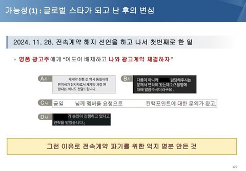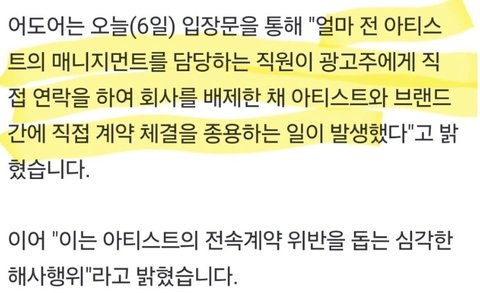 어도어 소속의 뉴진스 매니저가 광고주들에게 연락돌리며 어도어 빼고 멤버들과 직접계약을 요청함