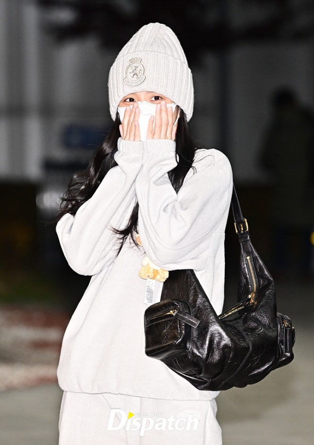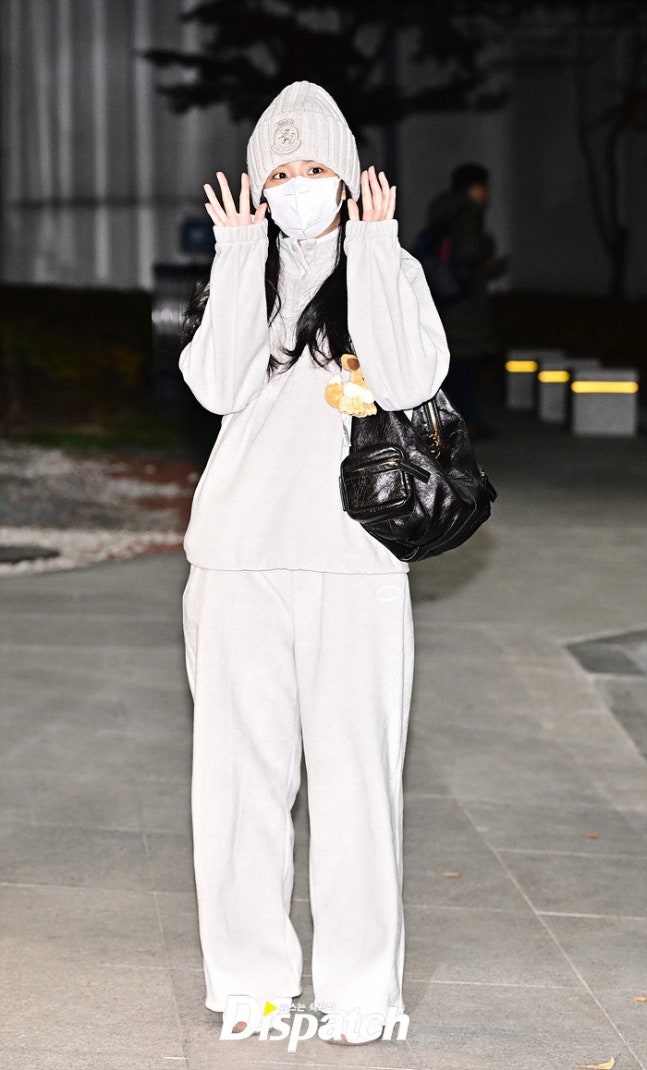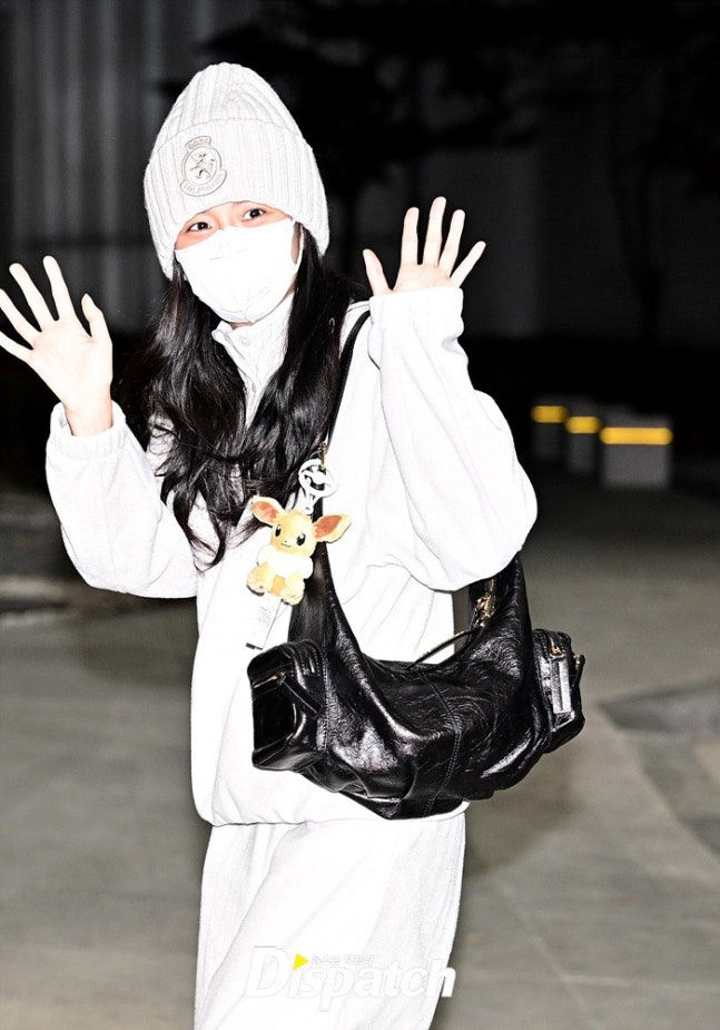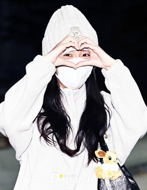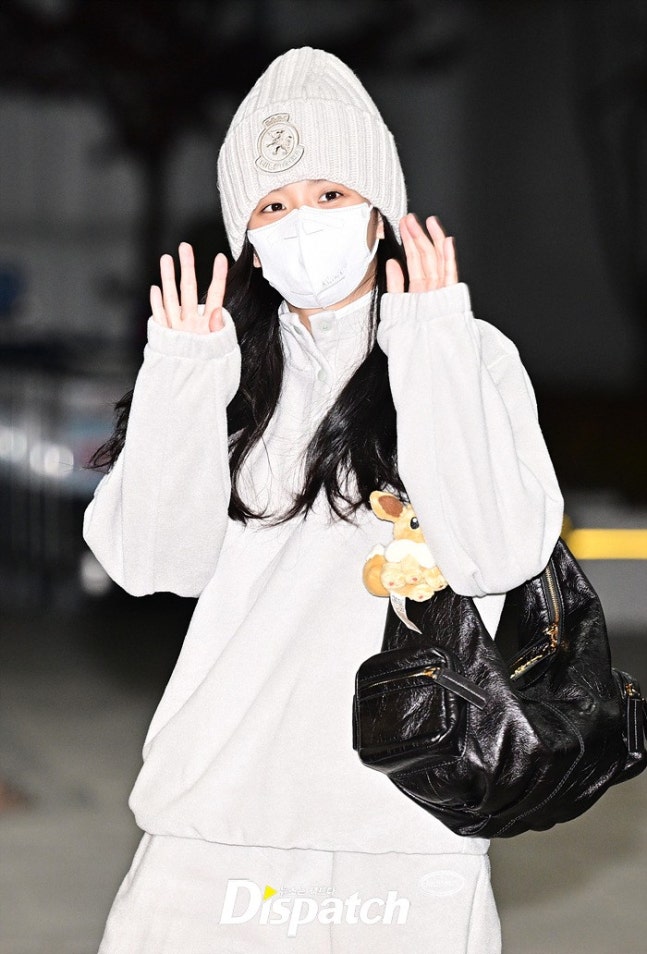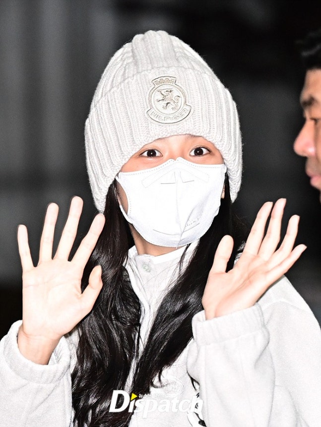 지수는 털모자로 귀여운 공항패션을 완성했다. 다양한 포즈로 팬들에게 감사의 마음도 전했다.
