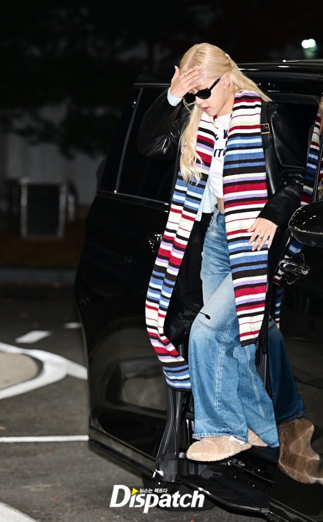 로제는 가죽재킷과 데님진으로 캐주얼한 공항패션을 완성했다. 러블리한 금발헤어와 해맑은 미소도 돋보였다.