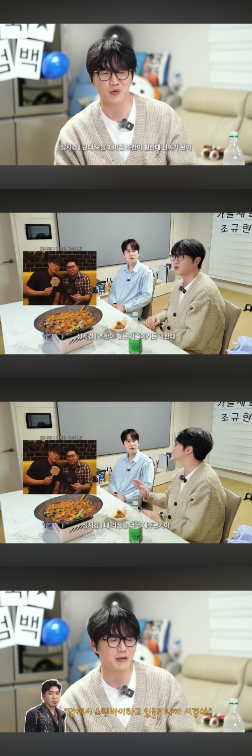 이날 영상에 출연한 성시경은 “오늘 때마침 조한이 형한테 전화가 왔다. 조한이 형은 가족이다. 내 걱정을 너무 해주는 거다”라며 말문을 열었다. 이어 그는 “형, 내가 정리되면 연락할게요. 너무 고마워요”라고 전하자, 조한은 “여기 스텐바이 하고 있을 테니까, 시경아”라고 답했다고 전했다.