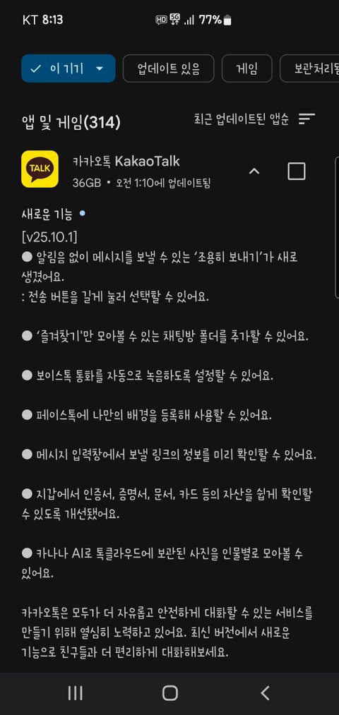 카카오톡 업데이트 안하고 버티고 있었는데 오늘 강제 업데이트 되었습니다