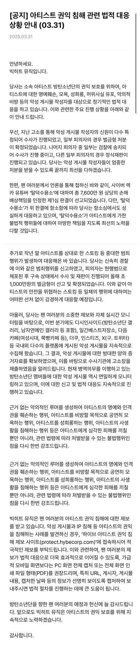 20250331 방탄 분기별 고소공지_알엠 진 슈가 제이홉 지민 뷔 정국 방탄소년단