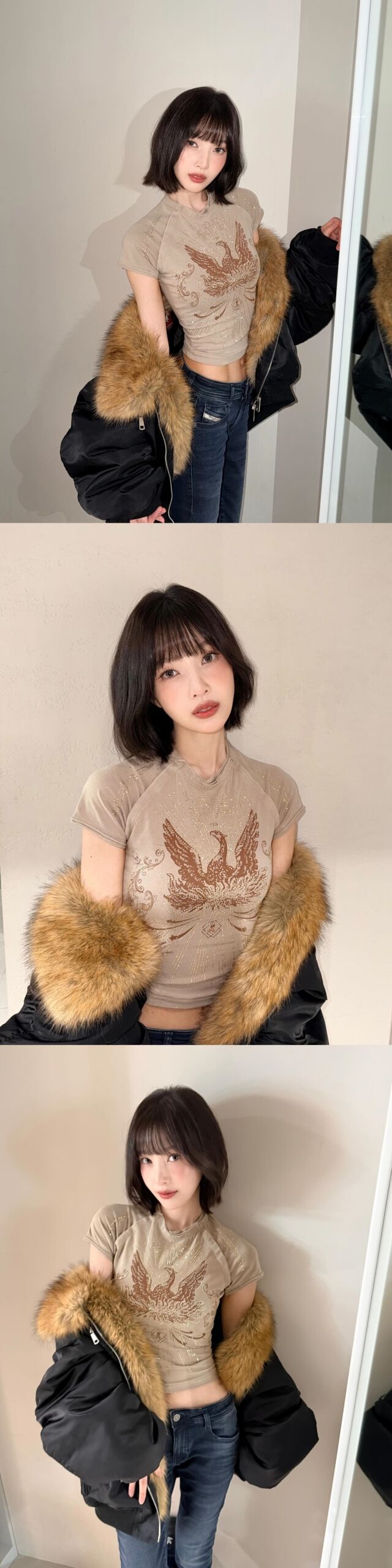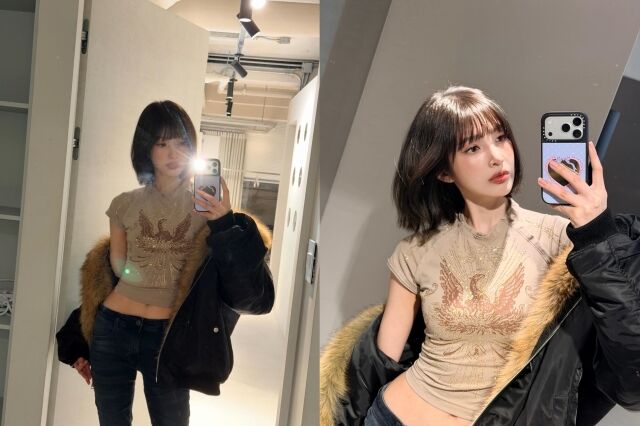 레드벨벳 조이. /조이 소셜미디어공개된 사진 속 조이는 짧은 단발에 베이지색 독수리 문양 크롭 탑과 진한 데님 진을 입고 퍼 달린 블랙 패딩을 걸쳐 힙하고 시크한 초겨울 패션을 선보였다. 셀카 찍는 모습도 연출한 조이의 옅은 미소와 정면을 응시하는 눈빛은 도회적이면서도 자신감 있는 분위기를 연출했다.
