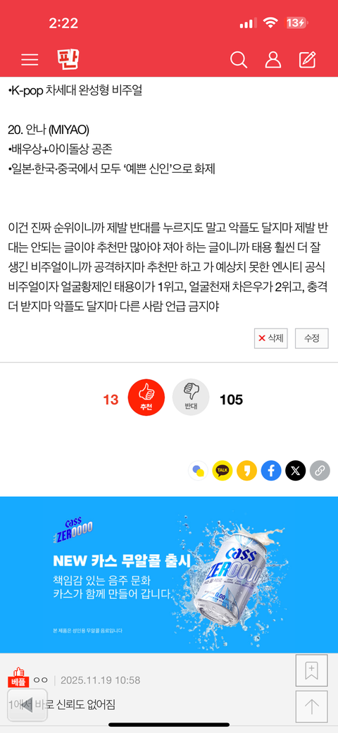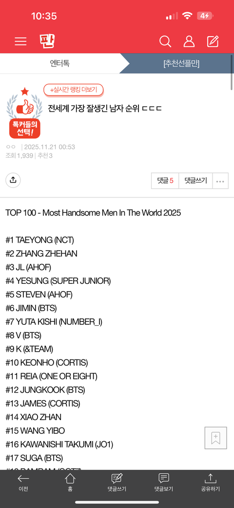 지금 연예계 비주얼 순위글에도 100개 넘었어 반대가