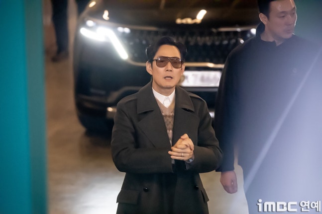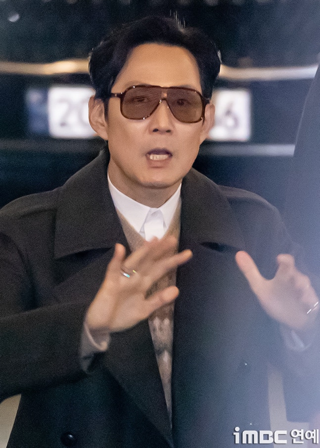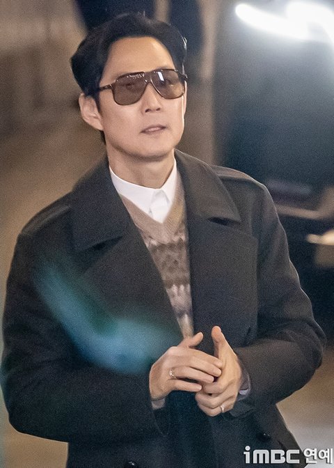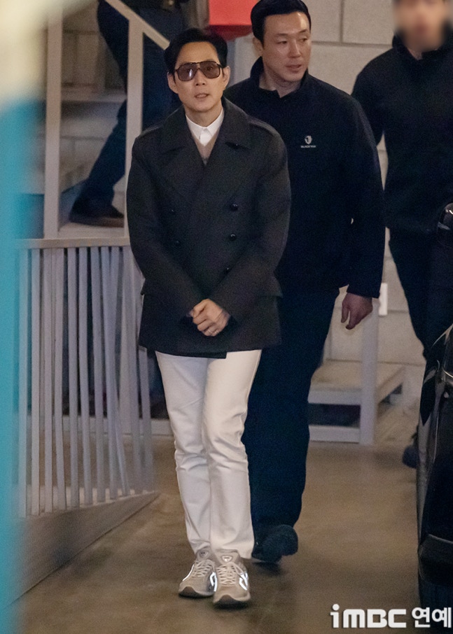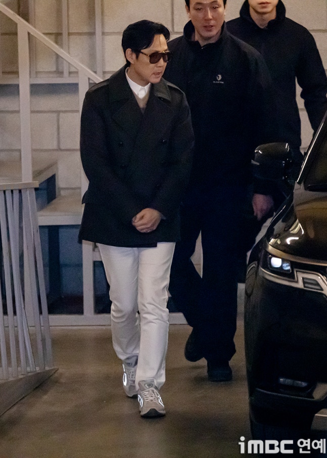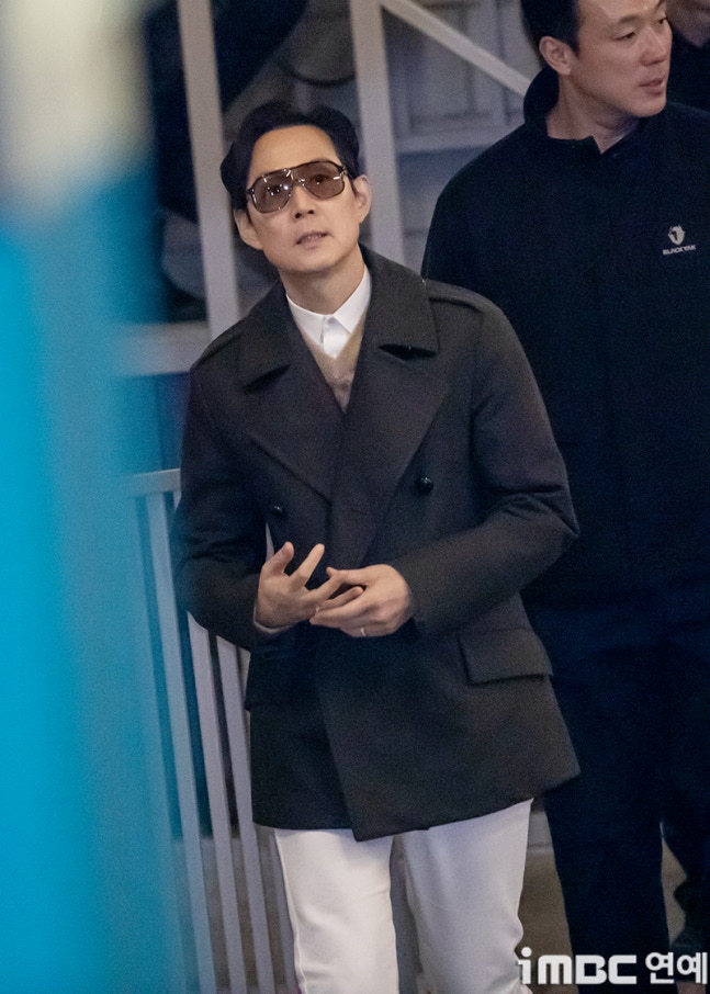 이정재는 출근길을 비롯해 퇴근길 역시 보잉 선글라스에 검정 반코트. 화이트 셔츠와 색맞춤 팬츠. 따뜻한 이너 니트에 편안한 운동화를 매치했다.