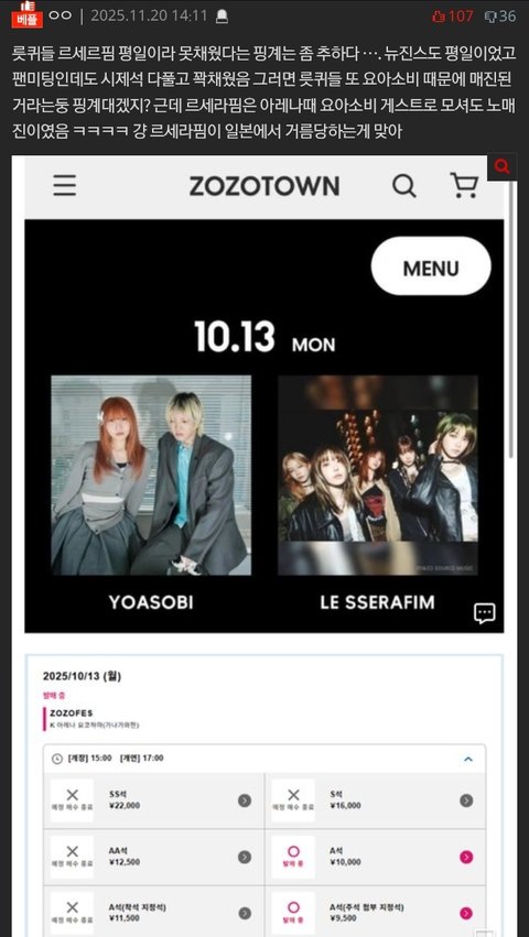 이거 르세라핌이 게스트로 요아소비 부른게 아니라 같은날 페스티벌 나간거잖아. 그리고 월요일이라 관객 채우기 힘들어서