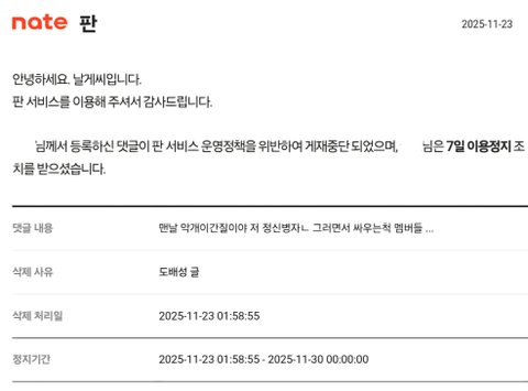 글삭튀전에 갑자기 내 댓글은 왜 정지시킨거야? 진짜 엄청 긁히셨나봐요 쌍욕을 한것도 아니고 거참 예민하시네