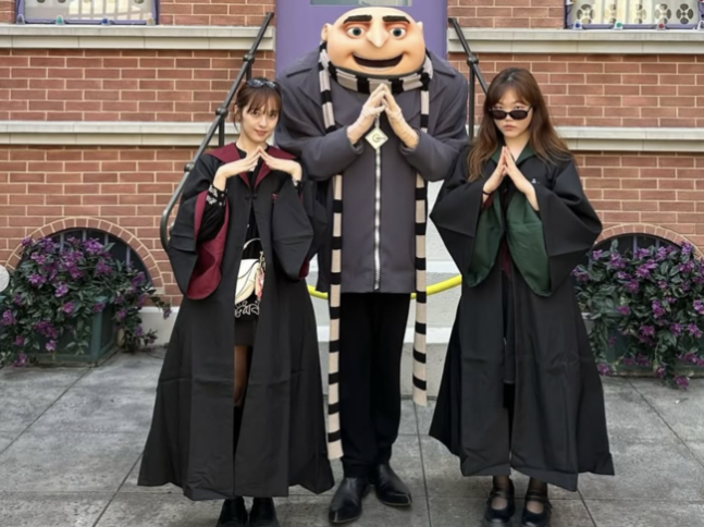 두 사람은 LA의 한 테마파크에서도 추억을 쌓았다. 공개된 사진에는 검은 로브를 걸치고 캐릭터 조형물 앞에서 같은 포즈를 취한 모습이 담겼다. 여행 내내 비슷한 스타일의 착장을 맞춰 입으며 남다른 ‘찰떡 케미’를 자랑했다.