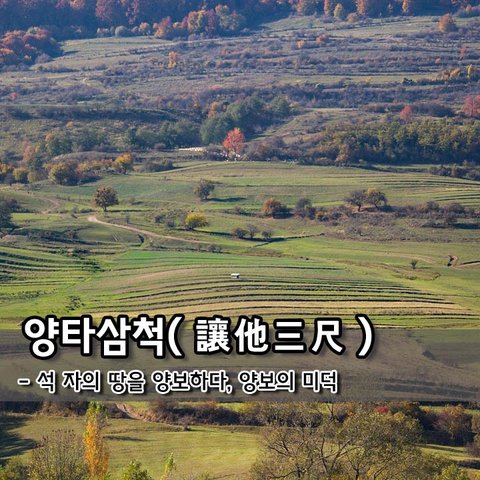 폭이 석자 되는 땅(三尺)을 다른 사람에게 양보한다(讓他)는 이 성어는 이웃과의 다툼을 피하기 위해 자신의 땅을 뒤로 물린 고사에서 나왔다. 손해를 감수한 양보의 미덕을 나타낼 때 쓴다. 이야기의 주인공은 淸(청)나라 康熙帝(강희제)때 재상을 지낸 張英(장영, 1637~1708)이란 사람이다.