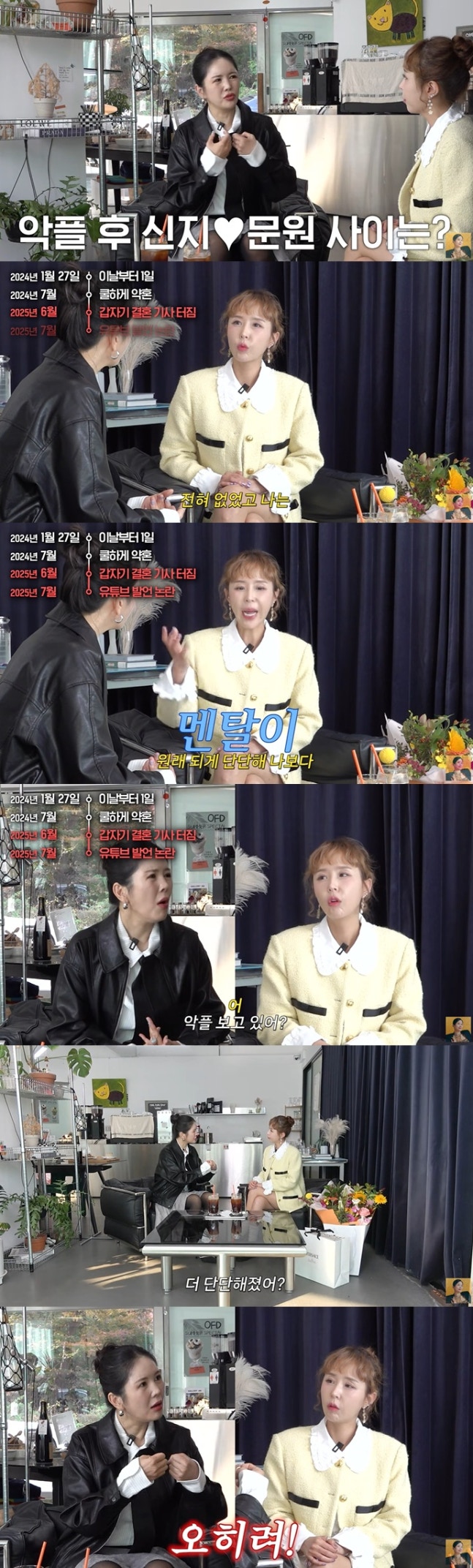 이날 신지는 결혼을 앞두고 문원과 코요태 멤버들이 만났던 '상견례 영상'을 언급했다. 그는 "영상이 조회수가 601만 회가 넘었다. 우리나라에 있는 모든 신점 보시는 분들이 우리 둘의 사주 궁합을 올리기 시작했다"고 말문을 열었다.