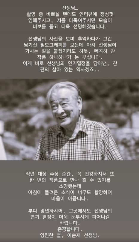 그는 "선생님. 촬영 중 바쁘실텐데로 인터뷰에 정성껏 임해주시고, 저를 다독여주시던 모습이 비보를 듣고 더욱 선명해졌습니다"라고 입을 열었다. 이어 "선생님의 사진을 보며 추억하다가 그간 남기신 필모그래피를 보는데 마치 선생님이 가시는 길을 붙잡기라도 하듯, 빼곡히 찬 작품 하나하나가 눈부십니다. 이게 바로 선생님의 연기열정을 담아낸, 한 편의 살아 있는 역사겠죠"라며 먹먹한 애도를 전했다.