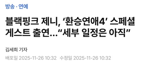 26일 마이데일리 취재 결과 제니는 티빙 오리지널 예능 '환승연애4'에 출연, 녹화를 앞두고 있다.