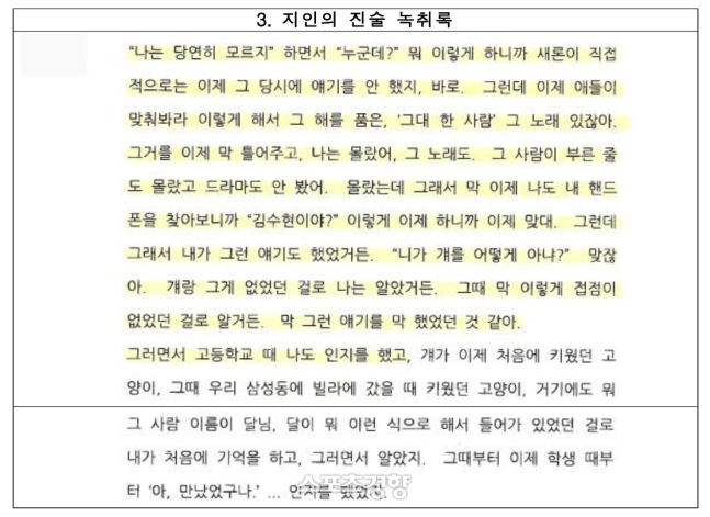 먼저 모친은 김새론의 지인이 고인이 미성년자 시절 김수현과 사귀었다는 진술을 했다고 강조했다. 그는 ‘저 ○○이랑, 론(김새론)이랑 제주도 갔을 때도 수현 오빠가 공항에 데려다 줬다’는 내용이 담긴 진술 녹취록 일부를 공개했다.