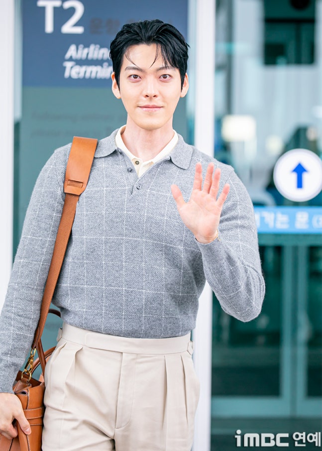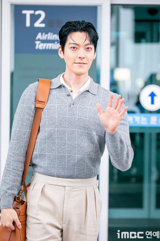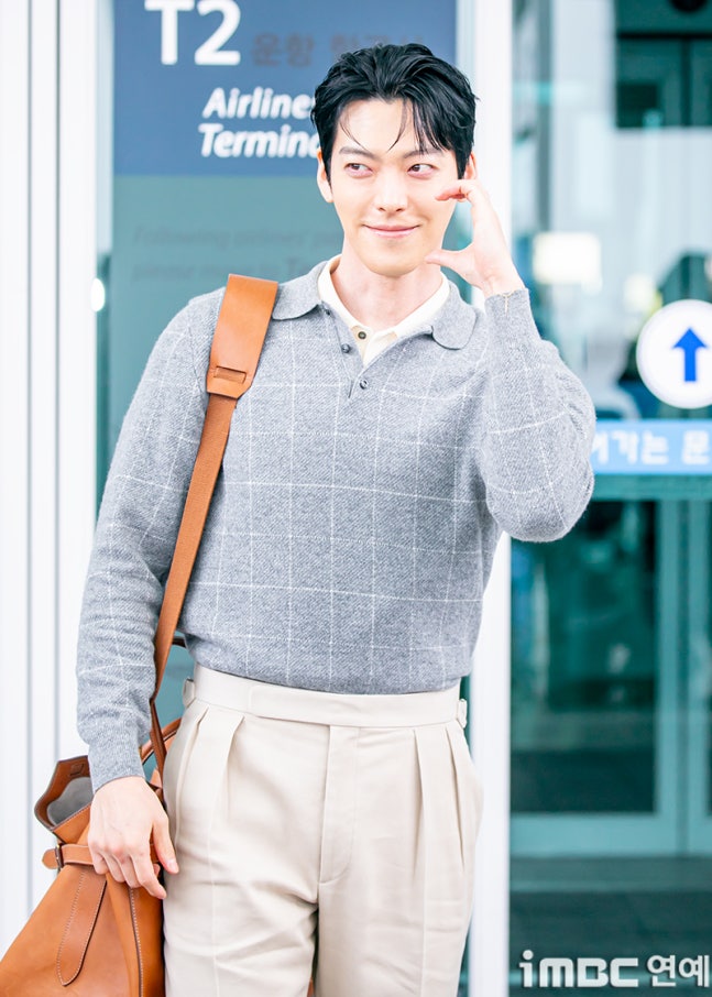 배우 김우빈이 27일 오후 방콕에서 진행되는 한 브랜드 매장 오프닝 행사에 참석 차 인천국제공항 제1여객터미널을 통해 태국으로 출국하고 있다.신민아와 결혼을 앞둔 김우빈은 이날 깔끔한 리젠트 헤어에 화이트 이너 PK티와 그레이 체크 상의, 하이웨스트 베이지 슬렉스 및 브라운 빅 백과 샌들로 색맞춤 등의 예비신랑 신혼여행 공항패션을 뽐냈다. 김우빈은 마치 예비신부에게 보내는 사랑의 하트 포즈를 취하며 출국장으로 향했다.