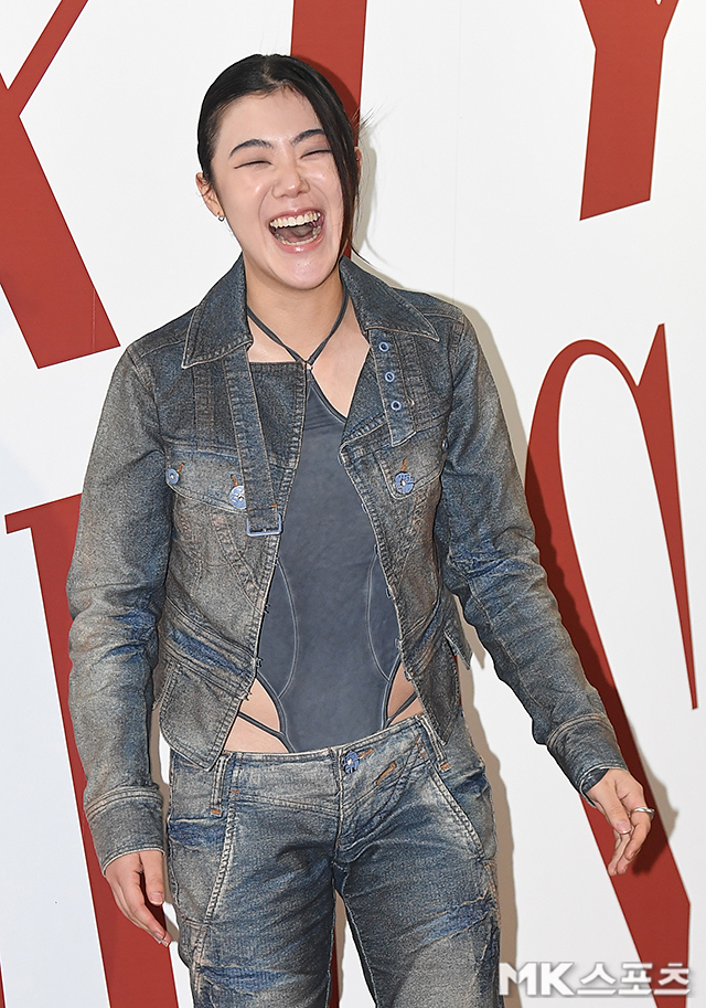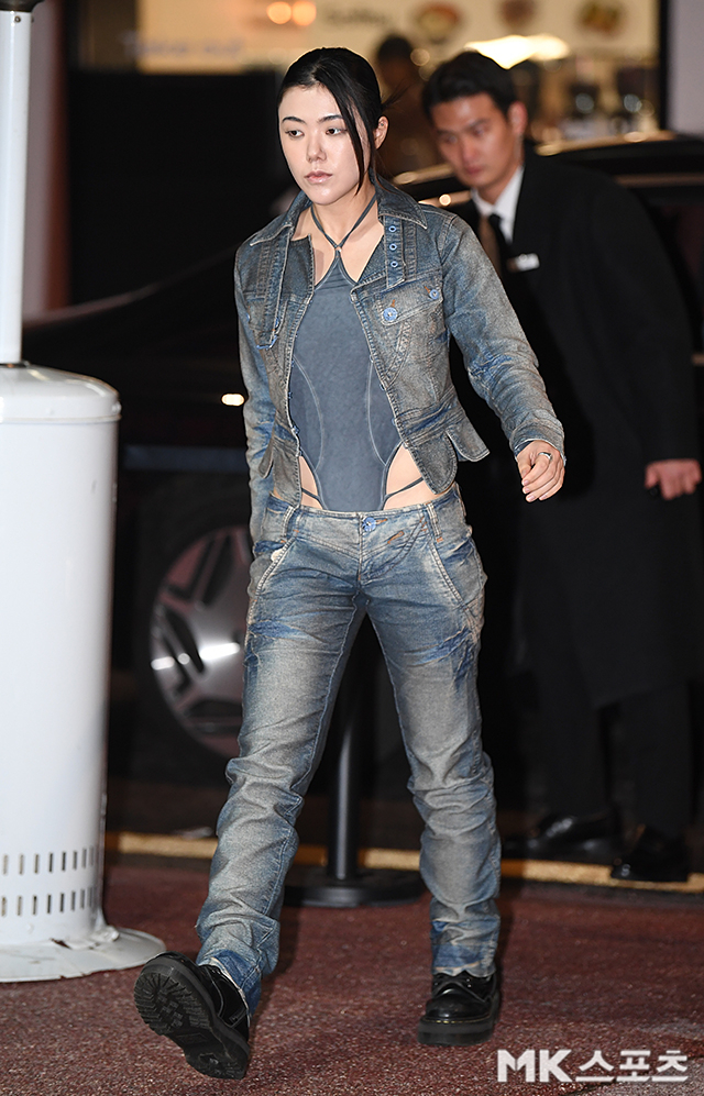 이날 황소윤은 Y2K 감성을 자극하는 블리치 워싱의 로우라이즈 데님 팬츠에 짧은 크롭 청자켓을 매치해 독보적인 개성을 드러냈다. 특히 치골 라인이 드러나는 바디수트 스타일의 이너웨어를 함께 착용해 과감한 매력을 선보였다.