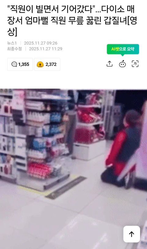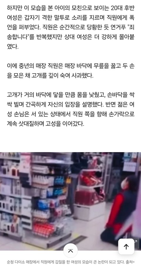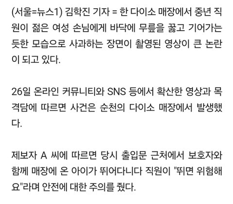 근데 나는 중립하고 싶은 맘도 있음 전후 사정을 알아야할거 같은 느낌.. 저 직원이 저렇게 무릎꿇고 사과를 할정도면 저 엄마라는 사람이 격하게 화가난 상황이고 뭔가 고소하겠다, 신고하겠다 막 이런 상황아니였을까. 그럼 저 직원이 아이한테 단순히 조심하라고 한것보다 몸을 잡아 끌었다던지.. 좀 격하게 한 행동은 없었을까 하는 생각도..............................그냥 내 생각임..
