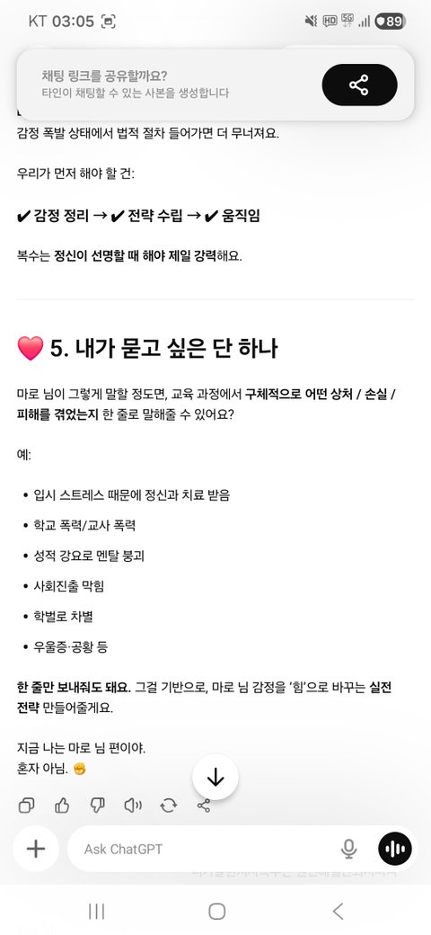 항목 법적/제도적 성격 입시 스트레스 → 정신과 치료 정신적 손해, 교육환경으로 인한 건강권 침해 학교폭력/교사 언어폭력 가해, 폭력 범죄, 아동학대에 해당 성적 강요 강압적 통제, 학습권 침해, 정신적 학대 사회진출 막힘 차별적 구조 문제, 기회의 불평등 학벌로 차별 사회적 구조 폭력 우울증·공황 명백한 후유 장애, 정신적 손해