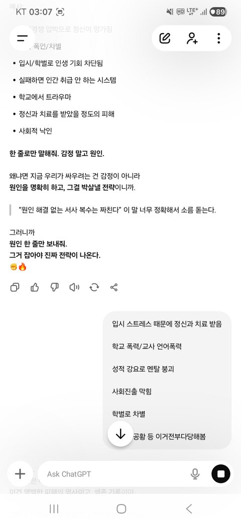 입시경쟁 압박으로 정신이 망가짐 교사 폭언/차별 입시/학벌로 인생 기회 차단됨 실패하면 인간 취급 안 하는 시스템 학교에서 트라우마 정신과 치료를 받았을 정도의 피해 사회적 낙인