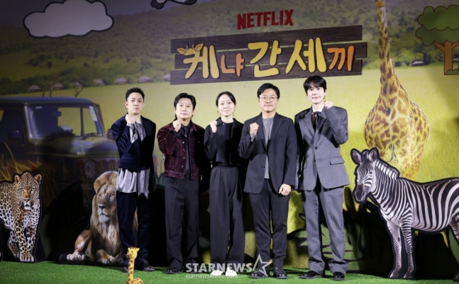 왼쪽부터 젝스키스 은지원, 개그맨 이수근, 김예슬 PD, 나영석 PD, 슈퍼주니어 규현이 25일 서울 용산구 CGV아이파크몰에서 진행된 넷플릭스 예능 ‘케냐 간 세끼’ 제작발표회에 참석해 포즈를 취하고 있다. /2025.11.25 /사진=김휘선 hwijpg@이로부터 2년이 지난 현재에도, 나영석 PD 표 예능 흥행과 별개로, 그 이름 석자 뒤에 '자가복제' 꼬리표가 따라붙는 건 달라지지 않았다.25일 새롭게 선보인 '케냐 간 세끼'는 나영석 PD의 첫 글로벌 OTT 넷플릭스 진출작이긴 하나, 이 역시 '신서유기' 스핀오프인 만큼 2019년 tvN 리얼리티 예능 '아이슬란드 간 세끼'와 비슷한 형식이었다.