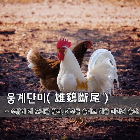 웅계단미雄鷄斷尾 - 수탉이 제 꼬리를 끊다, 재주를 숨기고 화를 피하여 숨다.