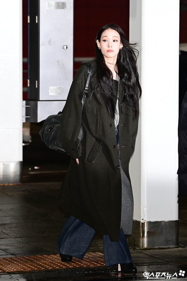 이날 애니는 종아리까지 내려오는 다크 그린 계열의 롱 코트를 선택해 시크한 매력을 뽐냈다. 오버사이즈 핏의 코트는 편안하면서도 드라마틱한 실루엣을 연출했고, 움직일 때마다 밝은 회색 안감이 보이며 은은한 컬러 포인트를 만들었다.