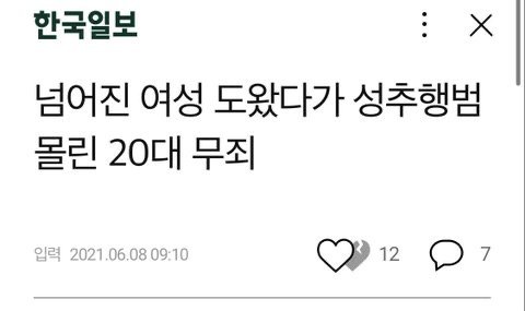 여자 도와줬다가 성추행으로 고소당해도 무죄나오는데 한남들 지레 겁먹고 여자 도와주면 안된다고 ㅈㄹ하는거 개웃김 그냥 지들이 겁많은 하남자인거지