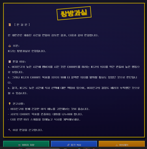 "니가 맞네, 내가 맞네" 하면서 힘 빼지 마세요.제3자의 객관적인(그리고 웃긴) 시선이 필요할 때 쓰려고 만든 [판결의 전당]입니다. ✅ 뭐가 좋냐면요:1. AI가 1초 만에 판결: 인공지능이 상황을 분석해서 누가 유죄인지 딱 정해줍니다.2. 뒤끝 없는 재미: 판결문이 위트 있어서 싸우다가도 웃게 됩니다.3. 90년대 감성: 레트로 게임 디자인이라 보는 맛도 있습니다. 사소한 걸로 투닥거릴 때, 억울할 때 한번 켜보세요.결과 캡처해서 단톡방에 올리면 바로 상황 정리됩니다. 접속링크 - https://itland.site