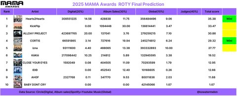 솔직히 두 팀 주는데 코르티스는 아니지 않나?? 주려면 하투하나 올데프 아님? 코르티스 불리자마자 읭?함 물론 코르티스도 좋은 음악 냈고 나도 즐겨듣긴 했는데, 객관적으로 아닌 거 같슨..