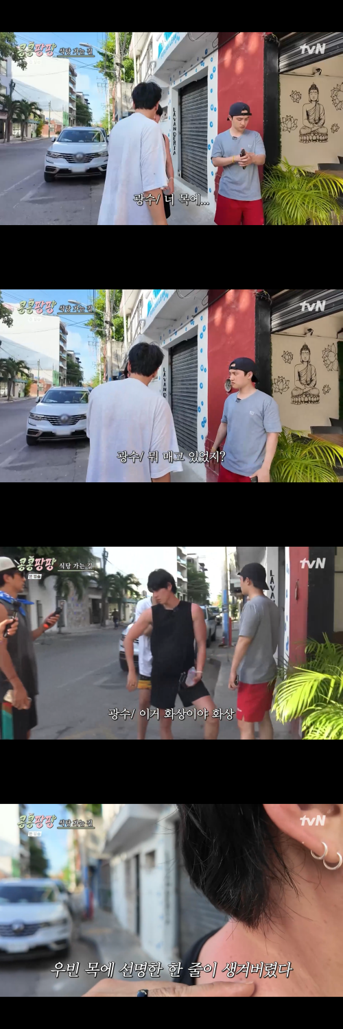 세 사람은 이날 고래상어 투어와 패러세일링 체험을 마친 뒤 늦은 점심을 먹었다. 식당 앞에서 탄 얼굴을 살펴보던 이광수는 김우빈의 몸을 보고 “이거 화상이다, 화상”이라며 걱정했다. 이어 김우빈의 목을 유심히 살펴보던 이광수는 갑자기 심각한 목소리로 “너 목에 뭐 매고 있었지? 줄이 생겼어.”라고 지적했다. 범인은 바로 마이크 줄이었다.
