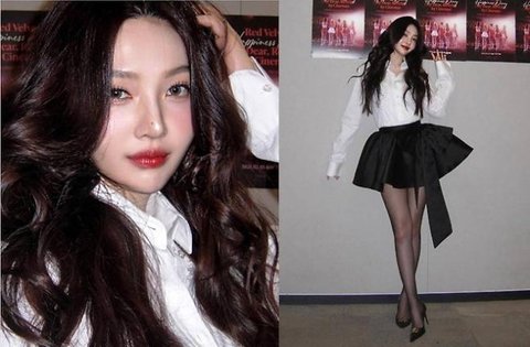 조이는 화이트 셔츠와 볼륨감 있는 블랙 리본 미니스커트를 매치해 여성스럽고 우아한 실루엣을 연출했다.사진=조이 SNS