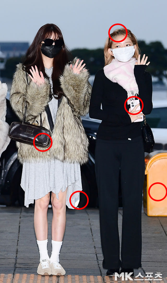 장원영과 레이의 출국길 사진에서 다른 부분 5군데를 찾아보세요.