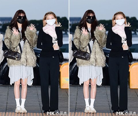 새벽 출국에 메이크업을 안 한 듯 짙은 선글라스와 마스크로 얼굴을 가린 장원영은 하늘거리는 얇은 원피스에 퍼 코트로 멋을 냈고, 마찬가지로 흰색 마스크를 착용한 레이는 얇은 블랙 재킷과 블랙 팬츠의 올블랙 패션에 화이트 머플러를 매치해 각각 개성 넘치는 공항패션을 완성했습니다.
