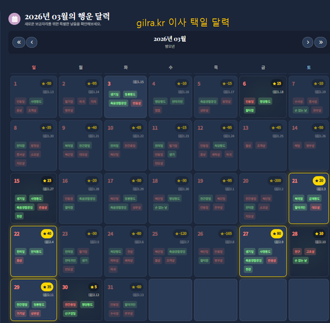 일일이 달력 뒤져보다가 제가 자주 보는 무료 운세 사이트에 깔끔하게 정리된 게 있어서 가져왔어요.