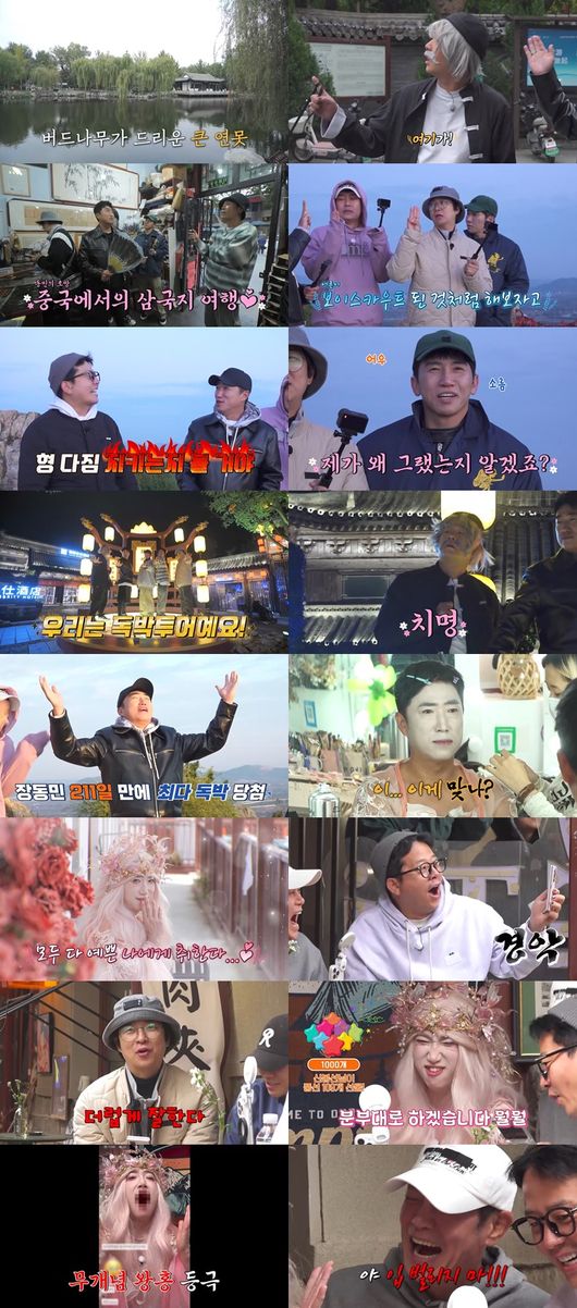 이후 ‘독박즈’는 ‘대형 붓’에 물을 묻혀 단어를 적은 뒤 랜덤으로 조합하는 ‘왕희지가 되자’ 게임을 했다. 모두가 엄청난 집중력을 발휘한 가운데, 제한 시간 안에 단어 조합에 실패한 꼴찌는 홍인규였다. 독박자가 된 홍인규는 ‘왕희지 고택 입장료’를 결제했고, 뒤이어 이들은 초대형 워터쇼로 유명한 ‘랑야고성’으로 자리를 옮겼다.