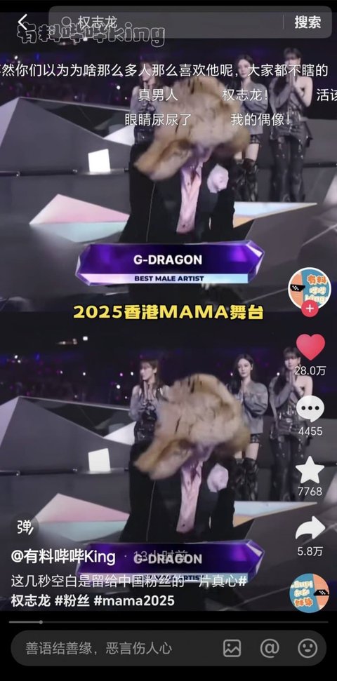 도우인(중국판틱톡)에서도 지디 상받는거 좋아요 30만개 받으면서 개흥하는중