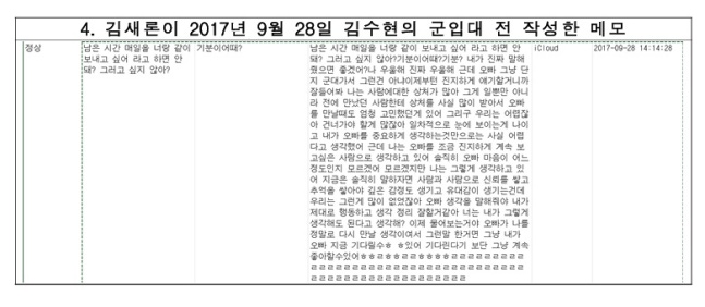 ▲ 김새론 측이 공개한 증거. 출처| 김새론 모친유족 측은 "고상록 변호사가 11월 11일 화요일 SBS PD를 통해 메모를 확인한 직후 본인의 유튜브 채널 게시물에 메모에는 '군대'라는 단어가 없었다고 했다"라며 "고상록 변호사는 이후 11월 26일 김새론 어머니가 보도자료를 통해 포렌식에서 추출된 김새론의 2017년 9월 28일자 메모를 공개하여 위 메모에 '군대'라는 단어가 있음을 확인하자 이번에는 두 가지 버전이 있다는 둥 재차 유족 측에게 증거 조작의 프레임을 씌웠다"라고도 주장했다.