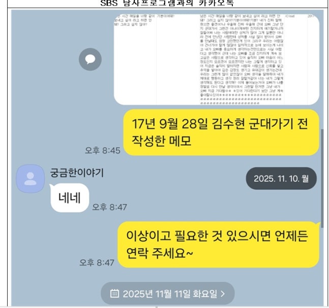 이어 SBS PD와 나눈 녹취와 녹취록을 공개했다. 해당 녹취록에서 SBS PD는 "제가 새로운 걸 만들리도 없다", "군대란 말도 없고, 근데 제가 사실은 제가 읽었을 때 있었던 것 같은데 '아, 이 양반이 그걸 못 봤나, 저는 속으로만 그 생각을 했다"라고 '그대로 보여줬다'는 취지로 답을 했다고 밝혔다.