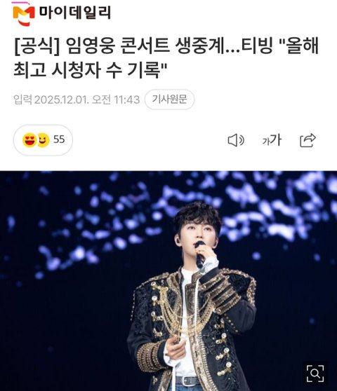지난 30일 오후 5시 올림픽공원 케스포돔(KSPO DOME)에서 열린 '임영웅 IM HERO TOUR 2025-서울' 티빙 독점 라이브는 동시간대 라이브 시청 점유율이 최고 95.3%에 달했으며, 올해 티빙에서 진행한 단일 라이브 콘텐츠 중 총 시청자 수(UV)와 최고 동시 접속자수 모두 가장 높은 수치를 기록했다.