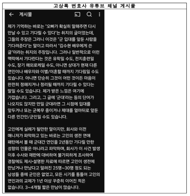 부 변호사는 유족 측이 제공한 포렌식 메모에 적힌 '군대'라는 단어를 두고 김수현 측이 재차 증거 조작 프레임을 씌우고 있다고 주장했다.
