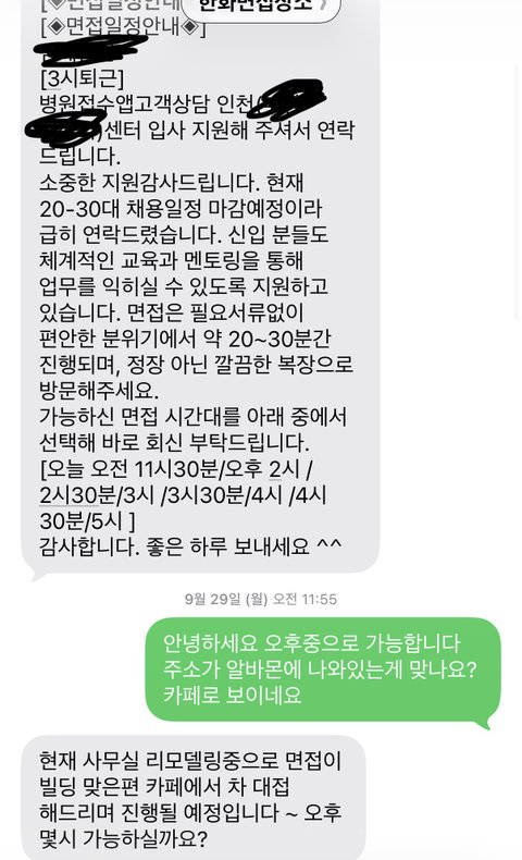 당시 면접은 일반 카페에서 진행되었으며, 면접 당시 실제 보험사명도 명확히 확인되지 않았습니다. 또한 구직 공고에 기재된 근무지가 실제 면접 장소인 카페로 표기되어 있어서.. 당시에도 뭐지..? 싶은.. 의아함을 느끼긴했어요