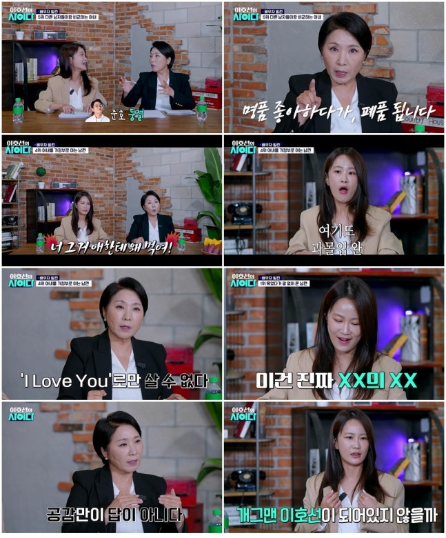 첫 회의 주제는 '배우자 수명 깎아 먹는 빌런'으로, 5위는 '다른 남자랑 비교하는 아내'였다. 옆집 남자와 사사건건 비교당하며 "왜 저 사람처럼 못하냐"라는 말에 자존감이 무너졌다는 남편의 사연에, 이호선은 "가질 수 없는 것만 좇으며 끝없이 비교하는 삶은 결국 자신도, 배우자도 불행하게 만든다"라고 지적했다. 이어 "이런 비교는 남편의 존재를 지우는 것이고, 아이들에게까지 왜곡된 가치관을 심어줄 수 있다"라며 문제의 심각성을 강조했고, "명품 좋아하다 폐품 된다"라는 직설적인 사이다 한 줄 평으로 상황을 통렬하게 정리했다.