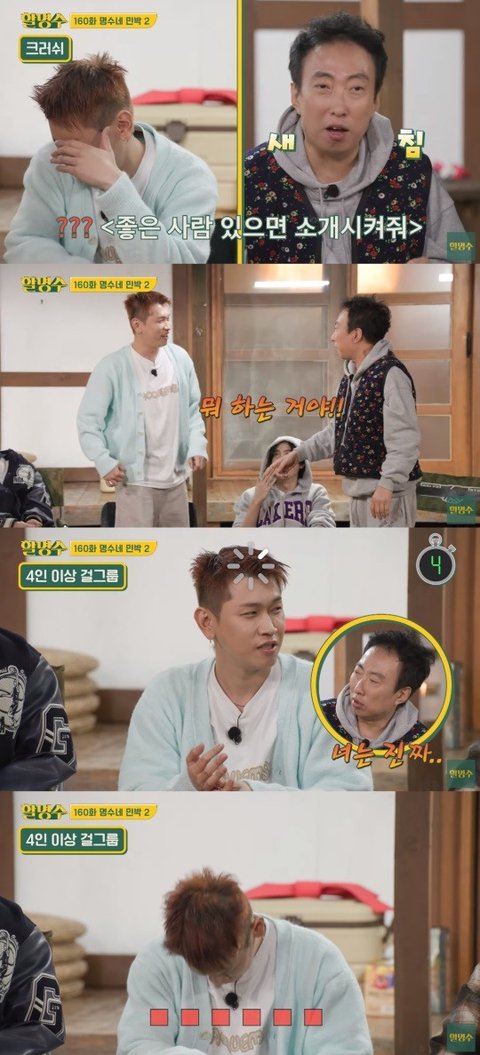 박명수는 당황한 나머지 레드벨벳 조이의 '좋은 사람 있으면 소개시켜줘'를 불렀다. 크러쉬는 현재 조이와 공개 열애 중. 크러쉬는 당황하며 "뭐하는 거야!"라며 소리쳤다.