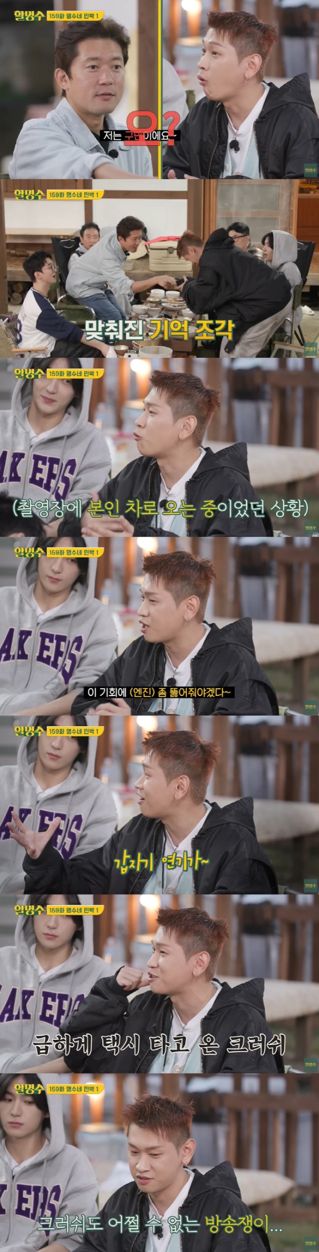 크러쉬는 앞선 상황에 대해 설명했다. 크러쉬는 "자차로 왔다. 엔진에 찌꺼기가 많아 고속주행이 필요했다. 서울에서 (촬영 장소)포천까지 거리가 있으니까 '이 기회에 엔진을 뚫어줘야 겠다'하고 달려서 오는 길에 경고등이 빨간 등으로 바뀌더니 갑자기 보닛에서 탄 냄새가 나면서 연기가 나더라"고 설명했다.이어 크러쉬는 "좀 큰일 날 뻔 했다"며 "그래서 매니저 분이 못 왔다. 택시 타고 왔다. 너무 긴장했었다"고 했다. 이를 들은 박명수는 "큰일날 뻔 했다"고 했고, 데프콘과 김대호도 "긴장 많이 됐지"라며 걱정했다. 이어 박명수는 "미안하다. 우리가 괜히 포천해서 해 가지고"라고 하자, 크러쉬는 "아니다. 좋은 에피소드가 생겼다"며 어쩔 수 없는 방송쟁이 모드로 눈길을 끌었다.