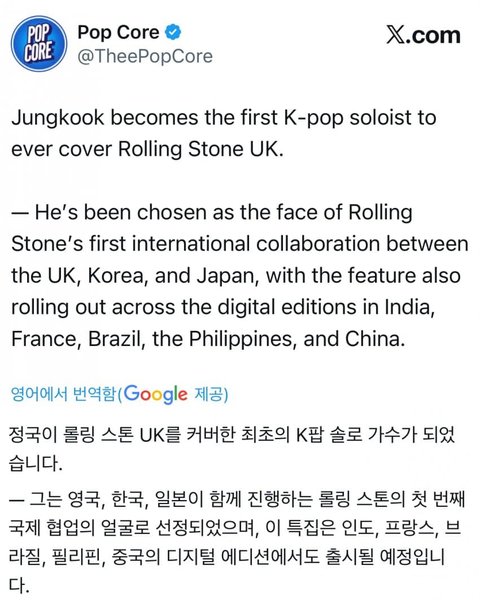 정국 롤링스톤 k팝솔로 최초래
