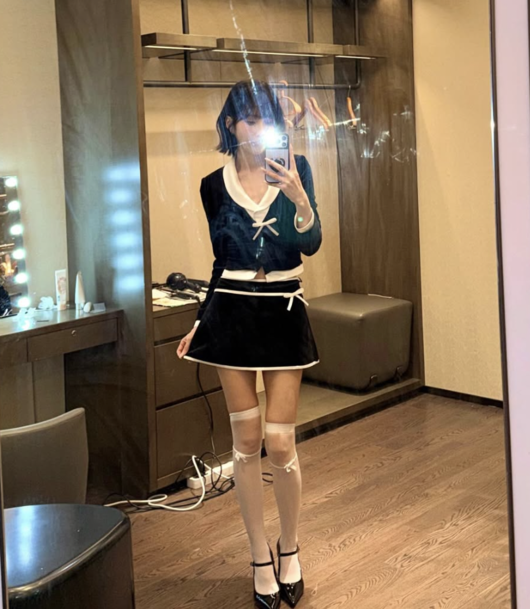 공개된 사진 속 조이는 블랙 벨벳 투피스에 화이트 포인트가 들어간 스타일링으로 고급스러운 분위기를 자아냈다. 허리가 잘록하게 드러나는 크롭 재킷과 미니 스커트, 그리고 무릎 위까지 올라오는 화이트 니삭스는 인형 같은 실루엣을 완성했다.