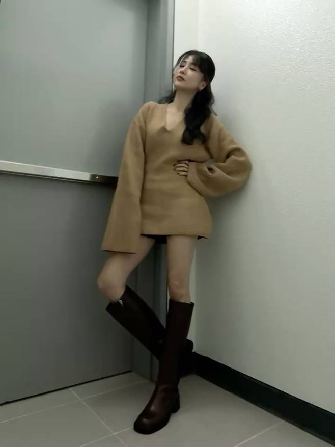 공개한 사진과 영상에서 박하선은 초미니 블랙 쇼츠 위에 오버핏 카멜 니트 스웨터를 착용한 하의실종 스타일로 과감하면서도 섹시한 출근룩을 완성했다.