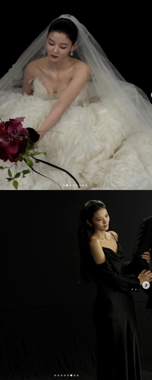 공개된 사진 속 김유정은 풍성한 플라워 텍스처의 웨딩드레스를 입고 우아한 자태를 드러내고 있다. 아름다운 드레스 실루엣 위로 떨어지는 베일과 단정하게 올린 헤어 스타일이 더해져 클래식한 분위기를 자아냈다.