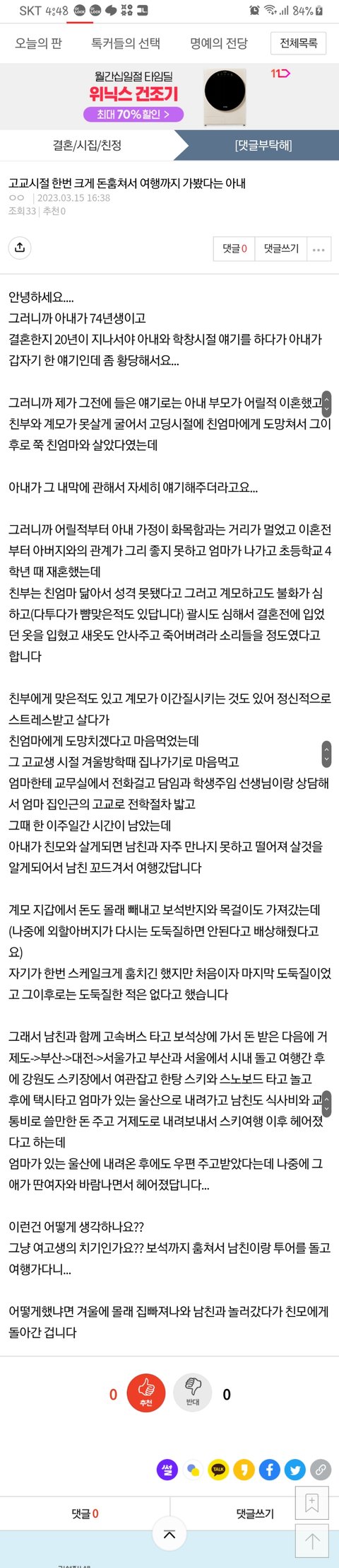 아내가 친모와 살게되면 남친과 자주 만나지 못하고 떨어져 살것을 알게되어서 남친 꼬드겨서 여행갔답니다
