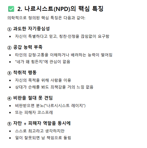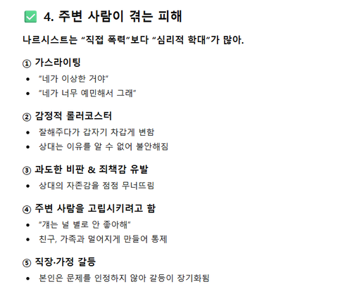 유일한 탈출구는 손절만이 정답이고, 함께 있으면 있을수록 인생이 망가짐.오직 나르시스트 본인만을 위해서 정서적 학대와 인생을 낭비하게 됨.
