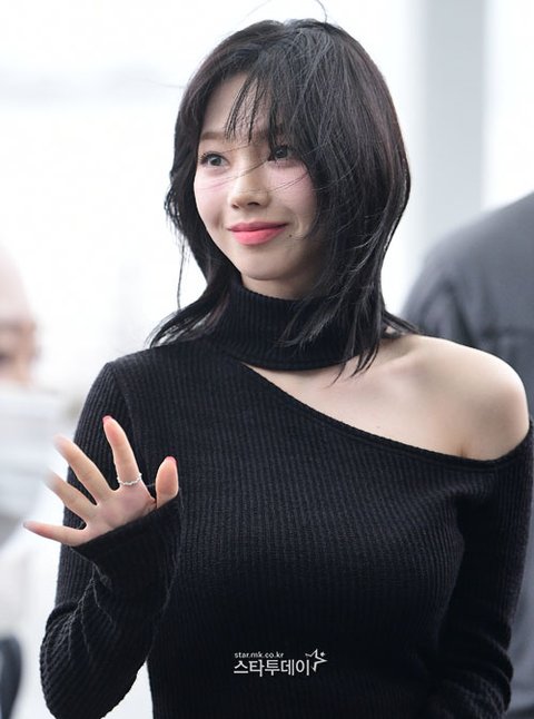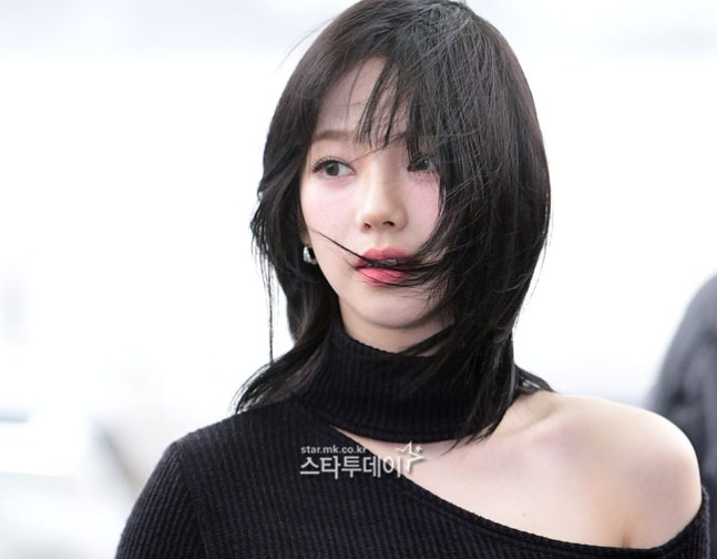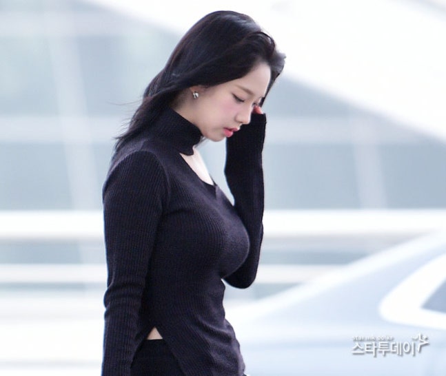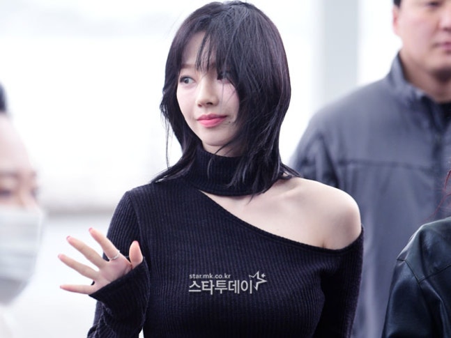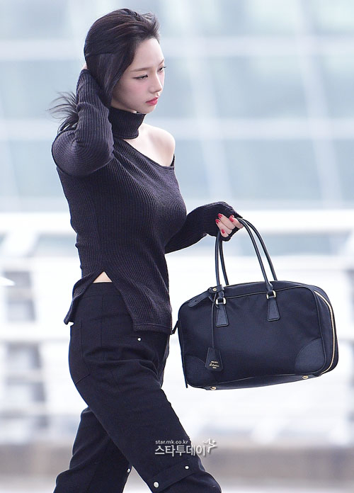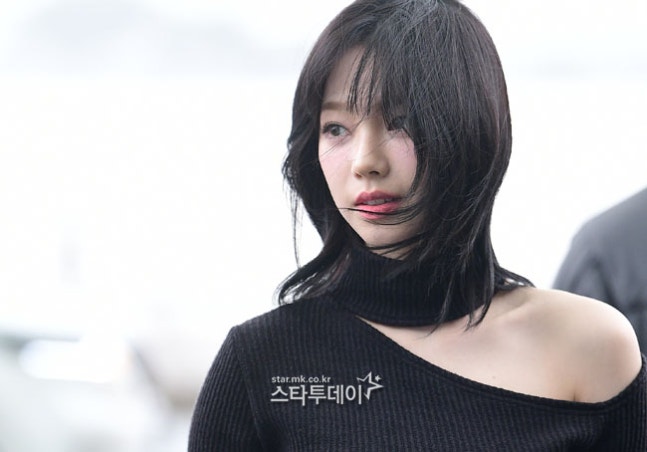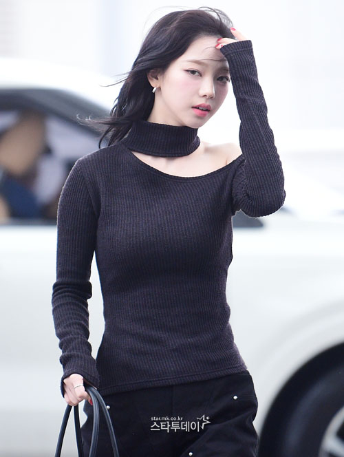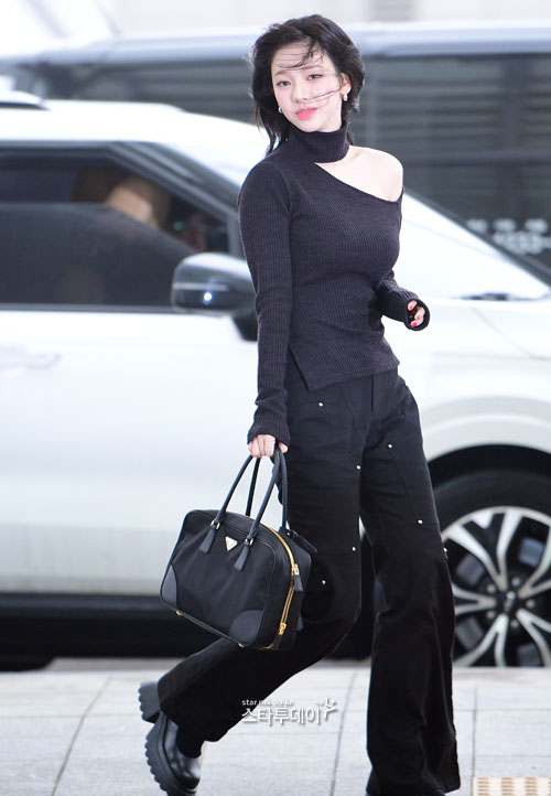 한쪽 어깨를 살짝 드러낸 블랙 의상을 입고 공항에 등장한 카리나는 미모를 시샘하는 듯한 강한 봄바람에도 흩트러짐 없는 비주얼을 자랑했다.